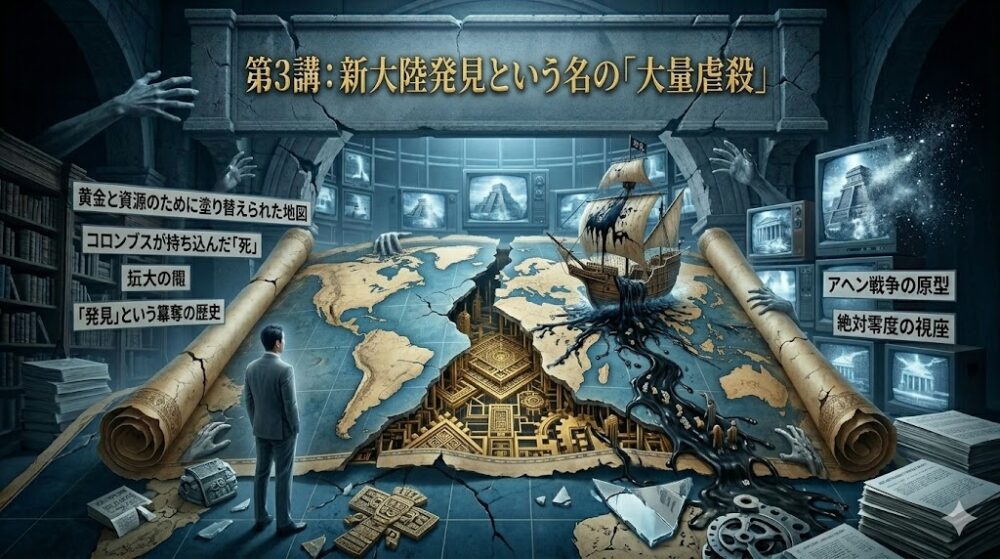 第3講:新大陸発見という名の「大量虐殺」 ―― 黄金と資源のために塗り替えられた地図。コロンブスが持ち込んだ「死」。 1492年、クリストファー・コロンブスがサン・サルバドル島に到達した。 教科書はこれを、偉大なる「新大 […]