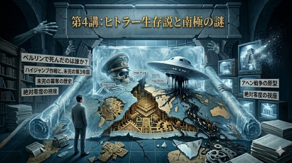 第5講:ヒトラー生存説と南極の謎 ―― ベルリンで死んだのは誰か?ハイジャンプ作戦と、未完の第3帝国。 1945年4月30日、アドルフ・ヒトラーはベルリンの地下壕で拳銃自殺を遂げた。 歴史の教科書はそう断言し、 第2次世 […]