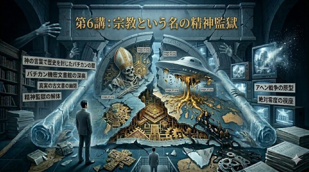 第6講:宗教という名の精神監獄 ―― 神の言葉で歴史を封じたバチカンの闇 「神は愛なり」。その甘美な響きの裏で、 人類の精神を2000年にわたって去勢し続けてきた巨大な施設がある。 絶対零度の視座で剥き出しにするのは、 […]